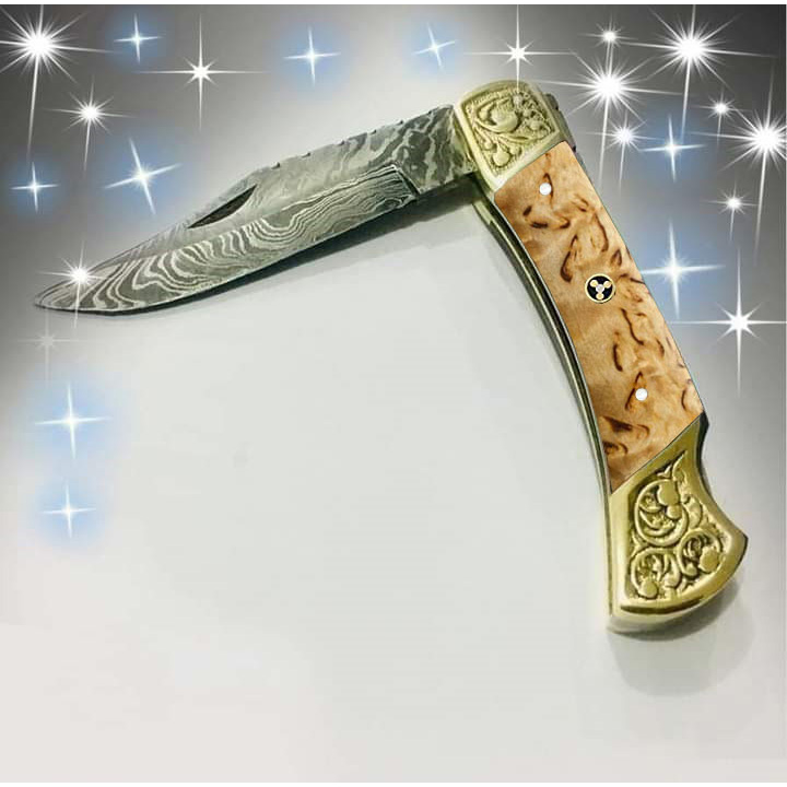 Birch Wood Handle Folding Hunter Lockback Pocket Knife Very Beautiful Gift Knife 4.25" long Damascus Steel Blade Product Size : 10cm